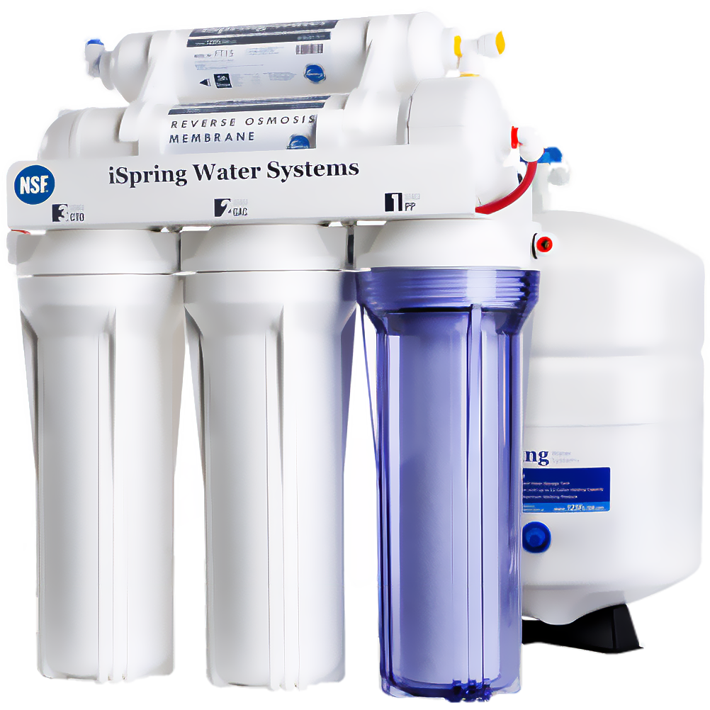 5-Stage 50 gpd RO Systems featuring double o-ring housings and a clear pre-filter housing for quick inspection of the sediment filter. Also features a 3.2 gallon NSF approved storage tank. This system utilizes push-connects fittings, 3/8″ faucet tubing, Angle Stop Adapter Valve and a chrome long-reach, lead-free faucet. Also includes filter wrench.